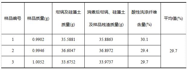 《NY/T 1459-2007 飼料中酸性洗滌纖維的測定》中對于重復(fù)性規(guī)定:酸性洗滌纖維(ADF)含量≦10%,允許相對偏差≦5%;酸性洗滌纖維(ADF)含量>10%,允許相對偏差≦3%。實(shí)驗(yàn)各樣品三次獨(dú)立測定結(jié)果相對偏差均小于3%,符合標(biāo)準(zhǔn)要求。