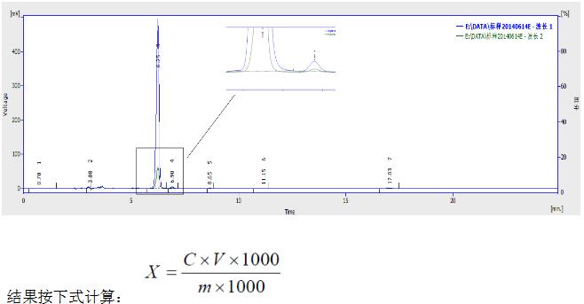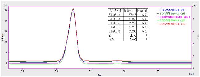 圖中可見,甜菊糖苷連續(xù)5針進樣,峰面積重復性RSD%0.004,保留時間重復性良好,完全滿足方法要求。
