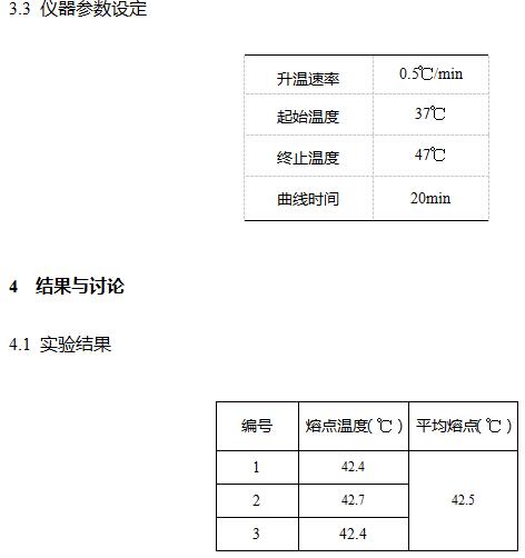 調(diào)節(jié)儀器溫度,設(shè)置合適的測(cè)試參數(shù),待溫度達(dá)到設(shè)定溫度后,從冰箱中取出毛細(xì)管樣品進(jìn)行測(cè)試,放到儀器加熱爐中開始測(cè)試,觀察并記錄每個(gè)毛細(xì)管油面浮升的溫度,計(jì)算其平均值,即為試樣的熔點(diǎn)。