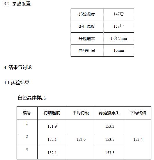 兩個(gè)樣品結(jié)果重復(fù)性均很好,符合標(biāo)準(zhǔn)中規(guī)定的樣品熔點(diǎn)在200℃以下者結(jié)果之差不應(yīng)大于0.2℃。儀器操作步驟簡(jiǎn)單,節(jié)省了時(shí)間,提高了工作效率。4.2結(jié)論