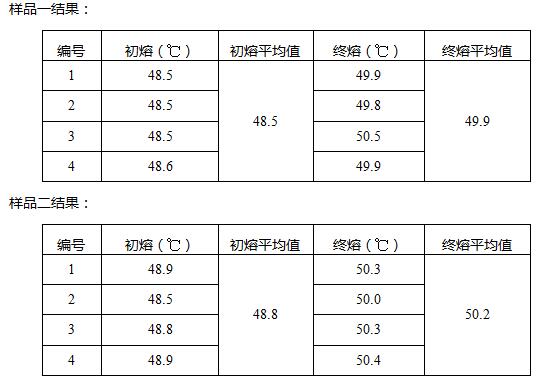 1.4.1 測定方法:將脂肪醇樣品用研缽研成粉末,將其裝入毛細管中,高度約3-5mm左右,注意裝樣時需均勻、顛實、所裝樣品的高度最好保持一致。設置儀器參數后進行實驗,記錄結果。