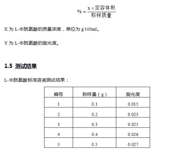 由于L-半胱氨酸有不對(duì)稱碳原子,當(dāng)偏振光通過時(shí)發(fā)生偏振面的旋轉(zhuǎn),因此具有旋光性。而偏振面的旋轉(zhuǎn)角度與溶液的濃度成正比。所以我們利用這一性質(zhì)配制一系列的標(biāo)準(zhǔn)濃度的L-半胱氨酸溶液來測(cè)定其旋光度。這樣就可以得出一條旋光度對(duì)濃度的標(biāo)準(zhǔn)工作曲線,按照以濃度為橫坐標(biāo),旋光度為縱坐標(biāo)做標(biāo)準(zhǔn)曲線,將測(cè)出的旋光度代入公式測(cè)出濃度,濃度乘以定容體積/稱樣質(zhì)量,從而計(jì)算出含量。