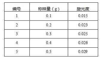 取5個烘干的50ml容量瓶,用分析天平分別稱取L-半胱氨酸0.1g、0.2g、0.3g、0.4g、0.5g,將樣品裝入容量瓶中,用1mol的鹽酸溶解并定容至刻度線,靜置,用旋光儀分別測定旋光度。