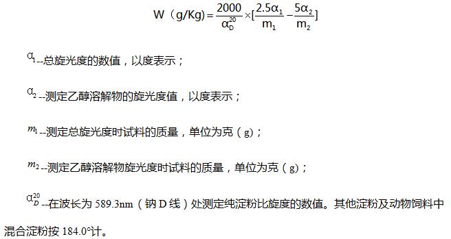 稱取5g制備好的試樣,精確至1mg,定量轉移到干燥的100mL容量瓶中,加40mL乙醇溶液(40%),振搖至形成均勻的懸濁液,然后再加40mL乙醇溶液(40%),加適當濃度的鹽酸以補充試樣的耗酸量,使瓶中內(nèi)容物的體積變化不超過1ml。用力振搖,在室溫下靜置1h,在此期間至少每隔10min振搖一次。用乙醇溶液(40%)稀釋至刻度,混勻,過濾,棄去最初數(shù)毫升溶液。吸取50mL濾液于100mL容量瓶,加入2.0mL鹽酸溶液(7.73mol/L)用力振搖,并將其浸入沸水浴中。15min±5s后,從水浴中取出容量瓶,立即加溫度不超過10℃的水30mL,轉動容量瓶并在冷水中冷至20℃左右。加5mL亞鐵氰化鉀溶液,振搖1min,加5ml乙酸鋅溶液,振搖1min,用水稀釋至刻度,搖勻,過濾,棄去最初數(shù)毫升濾,用旋光度測定濾液的旋光度(α2)。