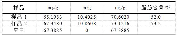 根據(jù)《GB/T9695.1-2008 肉與肉制品游離脂肪含量測(cè)定》,將數(shù)據(jù)處理后列于下表中,并且數(shù)據(jù)符合國標(biāo)要求。由表中數(shù)據(jù)可知,空白中因沒有樣品的加入,未萃取出脂肪。