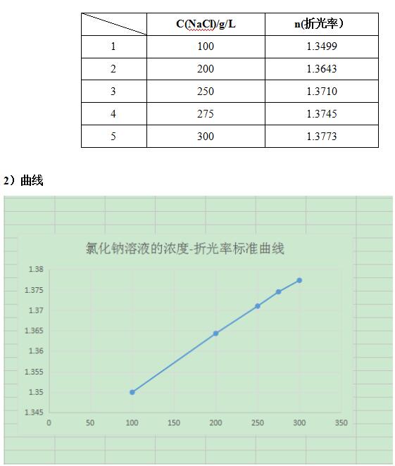 配置一系列氯化鈉標(biāo)準(zhǔn)溶液,通過測(cè)試其折光率繪制氯化鈉濃度和折光的標(biāo)準(zhǔn)曲線,測(cè)定未知濃度的折光率后通過標(biāo)準(zhǔn)曲線得出該樣品的濃度。