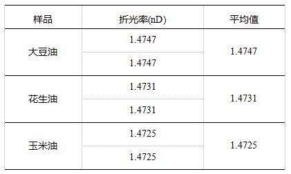 從上表中可以看出,用全自動(dòng)折光儀檢測(cè)食用油的折光率重復(fù)性很好。并且操作簡(jiǎn)單,節(jié)省了人力和時(shí)間。實(shí)驗(yàn)中采用三種食用油,通過其折射率值可初步判斷食用油的品種。而對(duì)于折射率非常接近的品種,僅從折射率還不能直接判斷,需借助其他方法如氣味等。