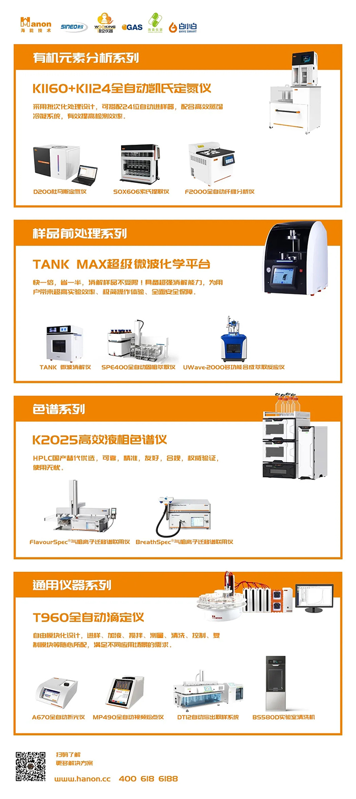 海能技術(shù)擁有海能、新儀、悟空、G.A.S.、海森、白小白6個(gè)品牌,逐步形成了以有機(jī)元素分析、樣品前處理、色譜光譜、通用儀器為主的四大系列百余款產(chǎn)品,廣泛應(yīng)用于食品、醫(yī)藥、農(nóng)林水產(chǎn)、環(huán)境、第三方檢測(cè)、化工、新能源、半導(dǎo)體、新材料、科研與教育等領(lǐng)域,為廣大科研工作者和質(zhì)量控制從業(yè)人員提供生產(chǎn)工具和分析檢測(cè)方法。