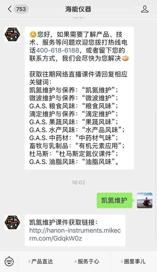 關(guān)注海能儀器公眾號,回復任意內(nèi)容獲取直播關(guān)鍵詞清單,再回復相應(yīng)關(guān)鍵詞即可獲取您想要的課件下載鏈接啦~是不是很簡單?