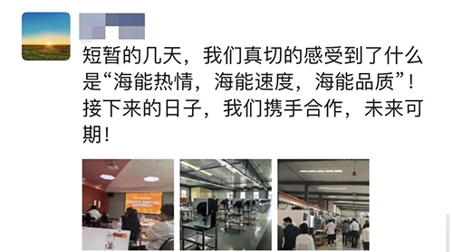 “短暫幾天,我們真切地感受到了什么是‘海能熱情,海能速度,海能品質(zhì)’,接下來的日子,我們攜手合作,未來可期!”活動結(jié)束,渠道商伙伴表達(dá)內(nèi)心感受,讓海能備受鼓舞,且榮幸為伙伴們帶來了妥帖體驗(yàn)。后續(xù)陸續(xù)還將有山西等地伙伴到訪,海能將繼續(xù)為大家提供貼心、專業(yè)的服務(wù)。