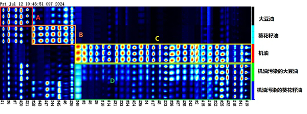機(jī)油與食用油揮發(fā)性成分具有顯著差別,機(jī)油具有獨(dú)特的揮發(fā)性有機(jī)物,如區(qū)域C所示,這些特有的揮發(fā)性成分,能夠?yàn)閰^(qū)分食用油和礦物質(zhì)油提供理論依據(jù)和參考。
