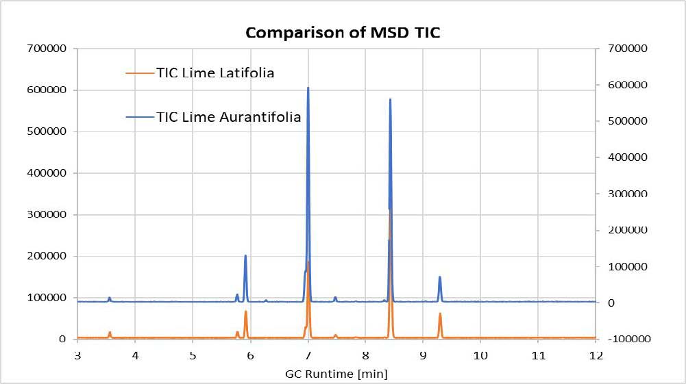 在其他氣味劑中,萜烯是一類(lèi)化合物,它們?cè)谥参铩⒒ā⑻崛∥锘蚓椭挟a(chǎn)生特定的香味,例如柑橘類(lèi)精油或柑橘類(lèi)餾分,廣泛應(yīng)用于香水或飲料工業(yè)。對(duì)于訓(xùn)練有素的專(zhuān)家來(lái)說(shuō),可以通過(guò)圖譜上的微小變化來(lái)確定重要的感官差異。但不同的萜烯比例很難用MS檢測(cè)器(結(jié)構(gòu)相似度,靈敏度)進(jìn)行表征,不同感官性質(zhì)的精油其總離子流圖可能沒(méi)有顯示出分子組成差異;另一方面,
