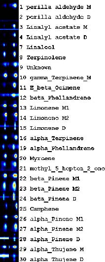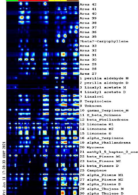 圖 9: Gallery-Plot指紋圖譜顯示柑桔3個(gè)亞科產(chǎn)品的單萜和倍半萜的強(qiáng)度(酸橙、檸檬和柑橘),每一種柑橘類(lèi)產(chǎn)品都有自己的指紋