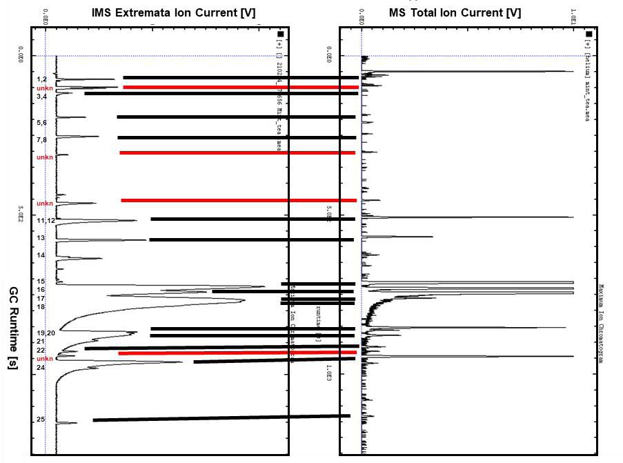 圖 5: MS-TIC 色譜圖與 GC-IMS 色譜圖進(jìn)行比較。 標(biāo)有紅線的信號(hào)表示在 NIST MS數(shù)據(jù)庫(kù)檢索無(wú)法識(shí)別的分子,而在VOCal 化合物數(shù)據(jù)庫(kù)中可以檢測(cè)(暫定識(shí)別)