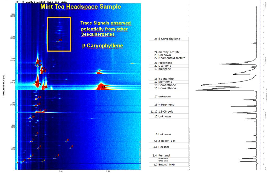靈敏度更為明顯,下圖為從一種商業(yè)薄荷茶的頂空中測(cè)得的GCxIMS色譜圖.