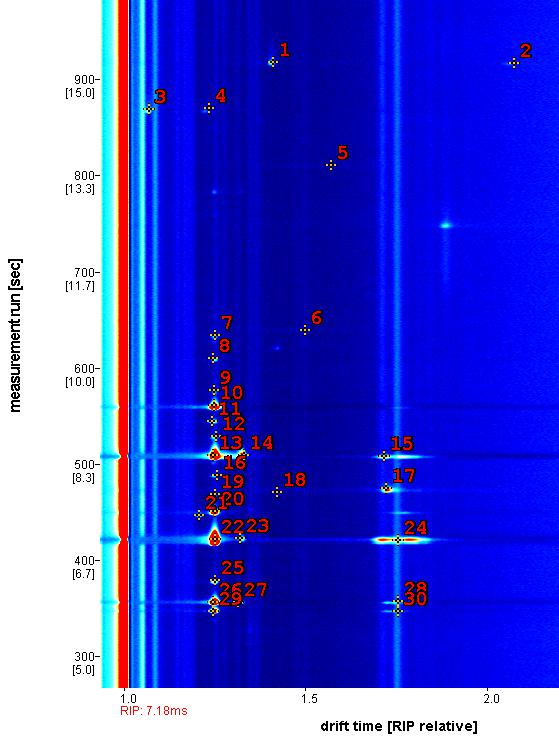 圖 8 左圖: 經(jīng)GC - IMS色譜(放大圖)初步鑒定出30個(gè)峰。右圖: Gallery-Plot指紋圖譜,直接比較相關(guān)峰,只有少數(shù)分子具有類(lèi)似的強(qiáng)度 ( 編號(hào)8,10,13-15 和 22-25)