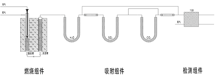 有機物中主要的元素為碳(C)、氫(H)、氮(N)、硫(S) 、氧(O)等。在高溫有氧條件下,有機物均可發(fā)生燃燒,燃燒后其中的有機元素分別轉(zhuǎn)化為相應穩(wěn)定形態(tài),如CO2、H2O、N2、SO2等。由載氣帶著燃燒產(chǎn)物氣體,經(jīng)過吸附柱進行吸附-解吸的分離,并依次進入TCD熱導檢測器檢測各成分的含量。